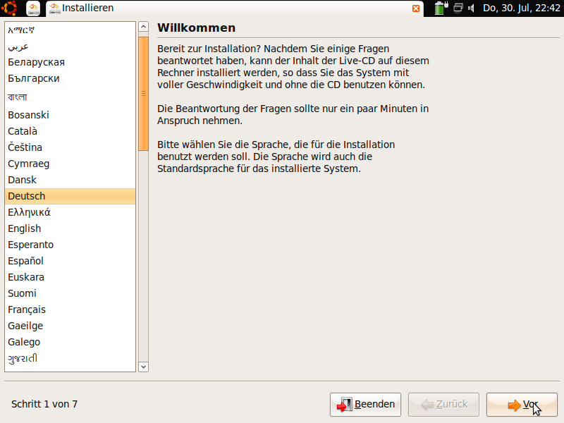 Nach der Installation wird der Eee PC neu gestartet und dabei das neu installierte Ubuntu gebootet. Jetzt kann man sich darum kümmern, die noch fehlenden Dinge zu installieren und einzurichten, wie im Folgenden beschrieben wird.